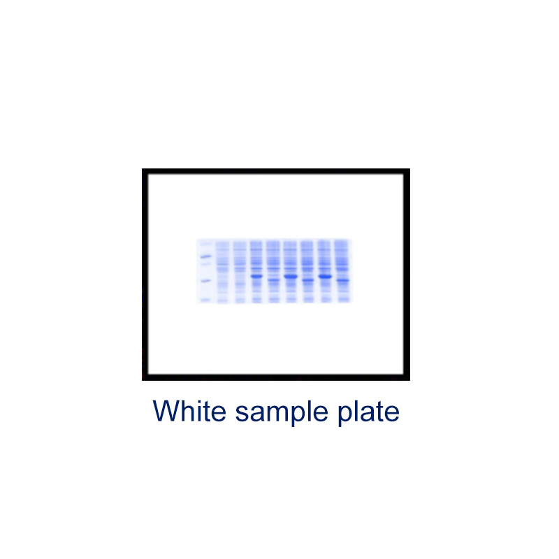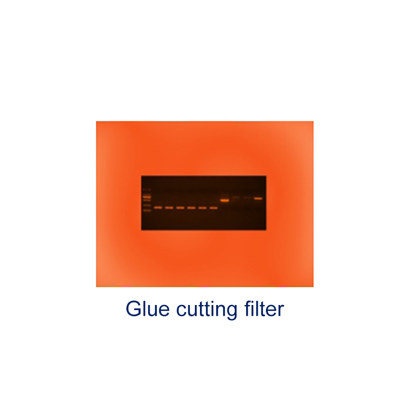 Специализированный накладной фильтр для резки клея, по сравнению с традиционным фильтром, имеет много преимуществ, прост в эксплуатации, может предотвратить повреждение УФ-излучением и синим светом, не требует работы в темной комнате, очень хорошо работает в условиях сильного освещения. Пластина для образцов белого света используется для съемки образцов клея SDS-PAGE.