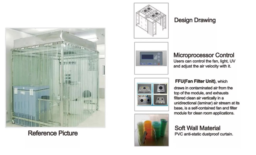 Чистая кабина — это своего рода оборудование для очистки воздуха, обеспечивающее частичную чистоту окружающей среды, это самый простой и быстрый способ построить простую чистую комнату. Оснащенный большим количеством чистых уровней и пространственных коллокаций, он может быть спроектирован по запросу. Основные характеристики: простота использования, хорошая гибкость, простота установки, короткое время строительства и мобильность. Он может быть установлен в части чистого помещения общего уровня, где требуется высокая чистота для экономии средств.