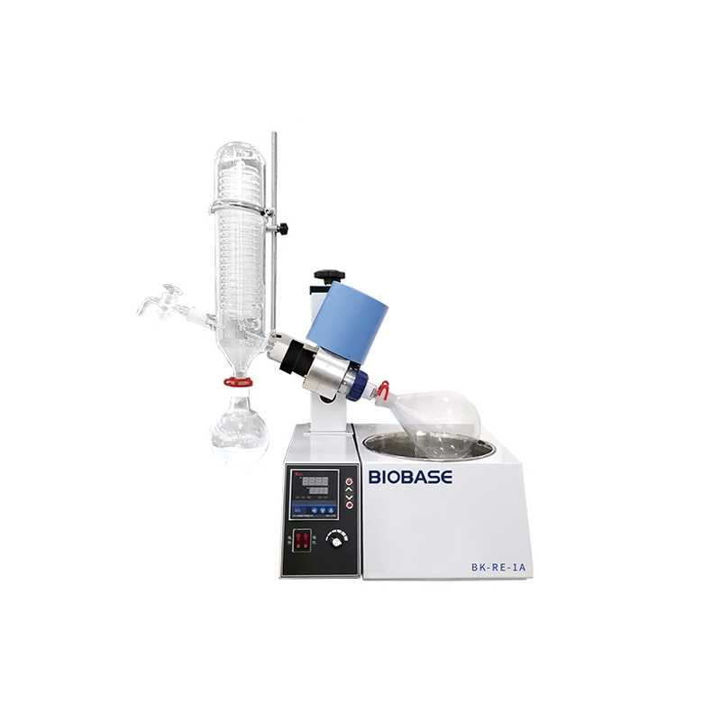 Роторный испаритель выполнен по принципу нагрева при постоянной температуре и пленочного испарения под вакуумом и отрицательным давлением. Роторный испаритель использует бесступенчатую регулировку скорости, чтобы стеклянная вращающаяся бутылка вращалась с постоянной скоростью, а материалы образуют однородную пленку большой площади на стенках бутылки.